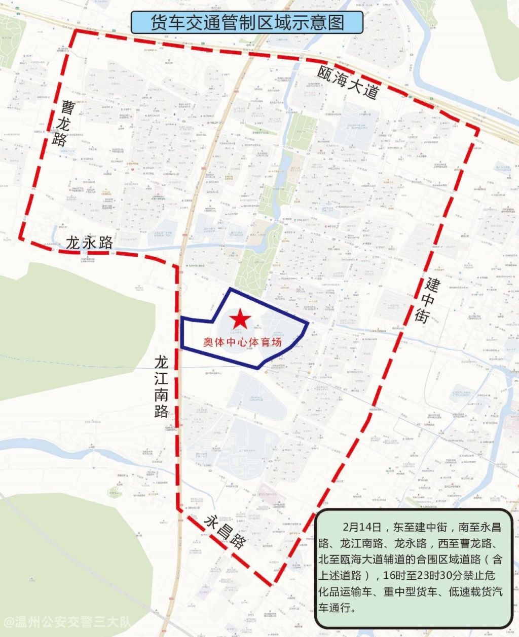 东至建中街,南至永昌路、龙江南路、龙永路,西至曹龙路、北至瓯海大道辅道的合围区域道路(含上述道路),16时至23时30分禁止危化品运输车、重中型货车、低速载货汽车通行。