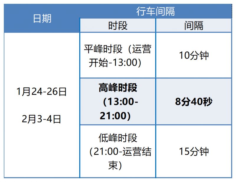 行车间隔也有相应调整:这五天,13:00-21:00期间,S1线、S2线行车间隔将缩短至8分40秒;21:00-运营结束,S1线、S2线行车间隔逐步拉大至15分钟。