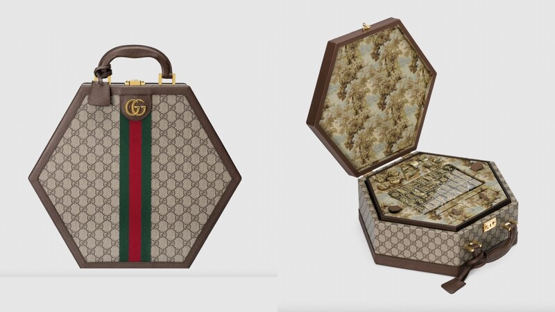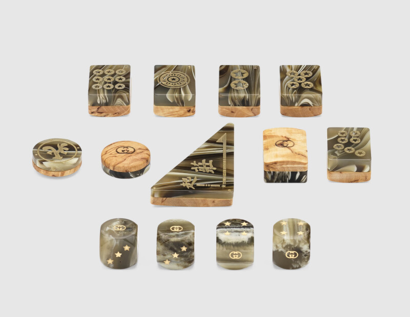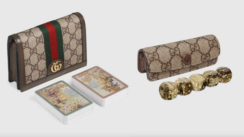 扑克牌组、骰子组 价格店洽 Gucci在桌游上散发着品牌的华丽感,以大理石纹搭配及桦木製作麻将牌组,专属的六角形收纳箱则是GG Supreme帆布设计,搭配上双G标誌及红绿织带点缀;除了麻将之外还有扑克牌与骰子组可以挑选。