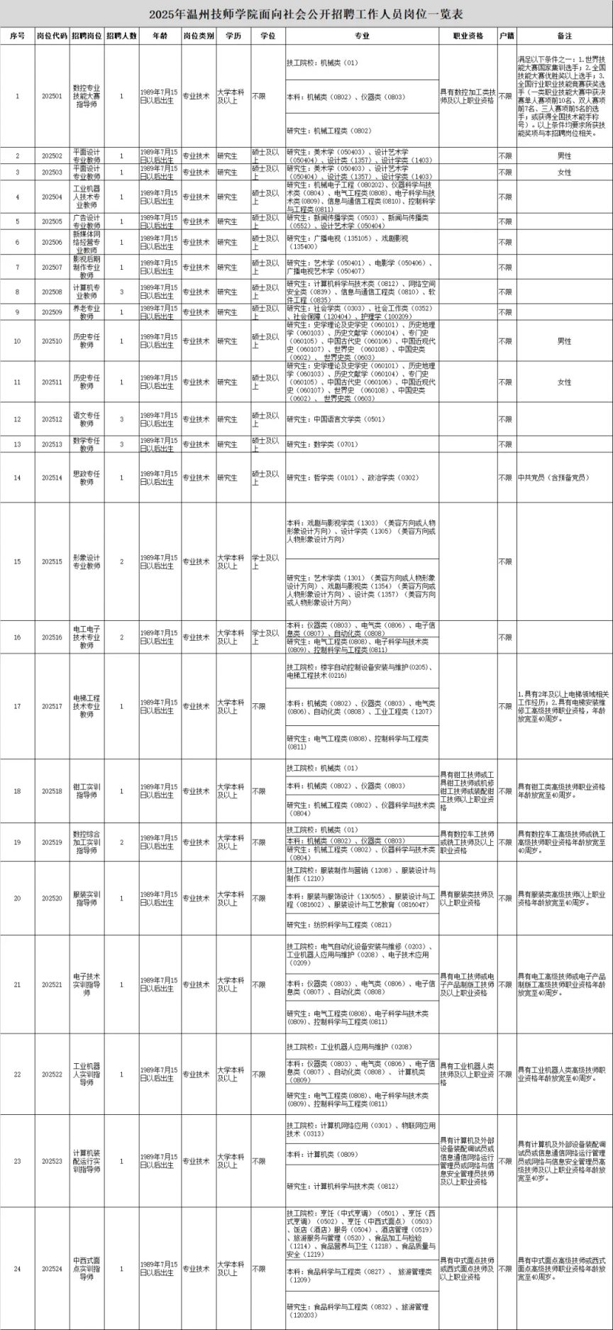 (一)招聘具体岗位、年龄及其他相关要求详见《2025年温州技师学院面向社会公开招聘工作人员岗位一览表》(附件1)。