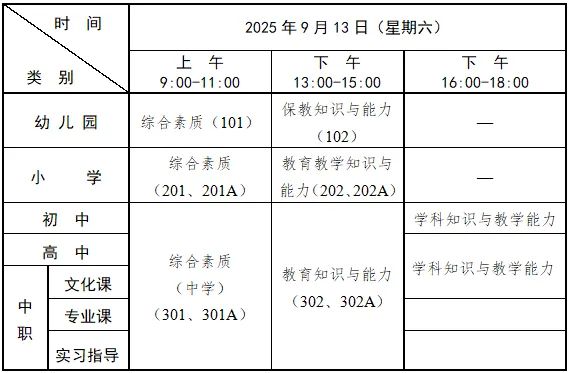 本次笔试考试日期为2025年9月13日,各科目考试时间均为120分钟,采用纸笔考试形式。