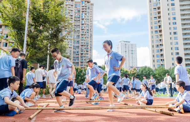 中国教育新闻网讯(记者 李小伟)每天随着大课间的铃声响起,温州市永嘉县瓯北中心小学的操场瞬间化身为一个五彩斑斓、沸腾着童趣与活力的“奇幻天地”:看,低年级“小豆丁”们的世界是铺展在脚下的彩色运动垫,他们就像一群灵巧的小鹿,在画着格子的“房子”间轻盈跳跃,在绳梯的方格中,双脚敏捷地点踏,编织出轻快的节奏,脸上洋溢着征服障碍后的开心笑容;中高年级区域的节奏变得更加明快、富有张力,竹竿舞区里,随着竹竿“嗒嗒”的开合敲击声,学生们化身为律动的精灵,在竹竿分合的瞬间轻盈地跳跃、转动;一旁的足球场和篮球场上,则是小小运动员们的竞技场—伴随着追逐与呐喊,足球在脚下灵动地穿梭。篮球则在空中划出优美的弧线,撞击篮板的声音与进球的欢呼汇成交响乐。昔日略显沉闷的校园操场,此刻真正成为了一片奔涌着无限活力与纯真欢笑的“欢乐海洋”……这生动的一幕,正是学校“每天2小时”体育实践最鲜活、最动人的写照,也是温州市学校落实“中小学生每天综合体育活动时间不低于2小时”的一个缩影。